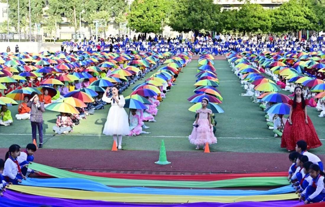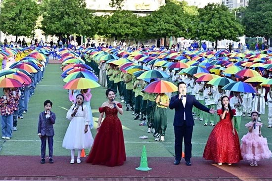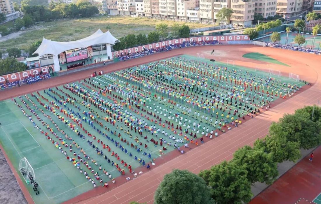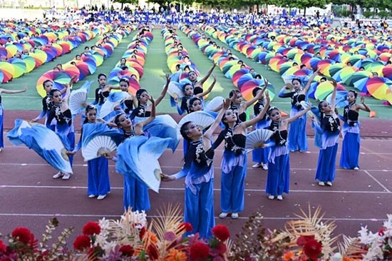 随着《我的祖国》悠扬深情的旋律缓缓流淌 1400余名学子手持彩虹伞 如潮水般涌入绿茵场 下一刻,壮观的图景徐徐展开: 伞面时开时合,似江河潮涌,波澜壮阔 又如繁花盛放,生机盎然 在《玉盘》清越的伴奏下 舞蹈队的同学携彩扇翩跹 如流霞漫天 彩绳队穿梭变幻 若锦绣铺展