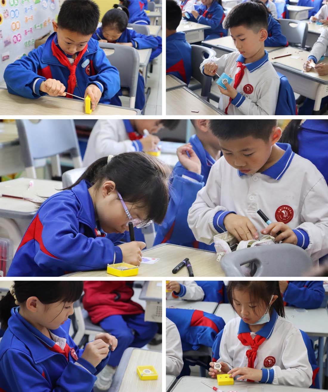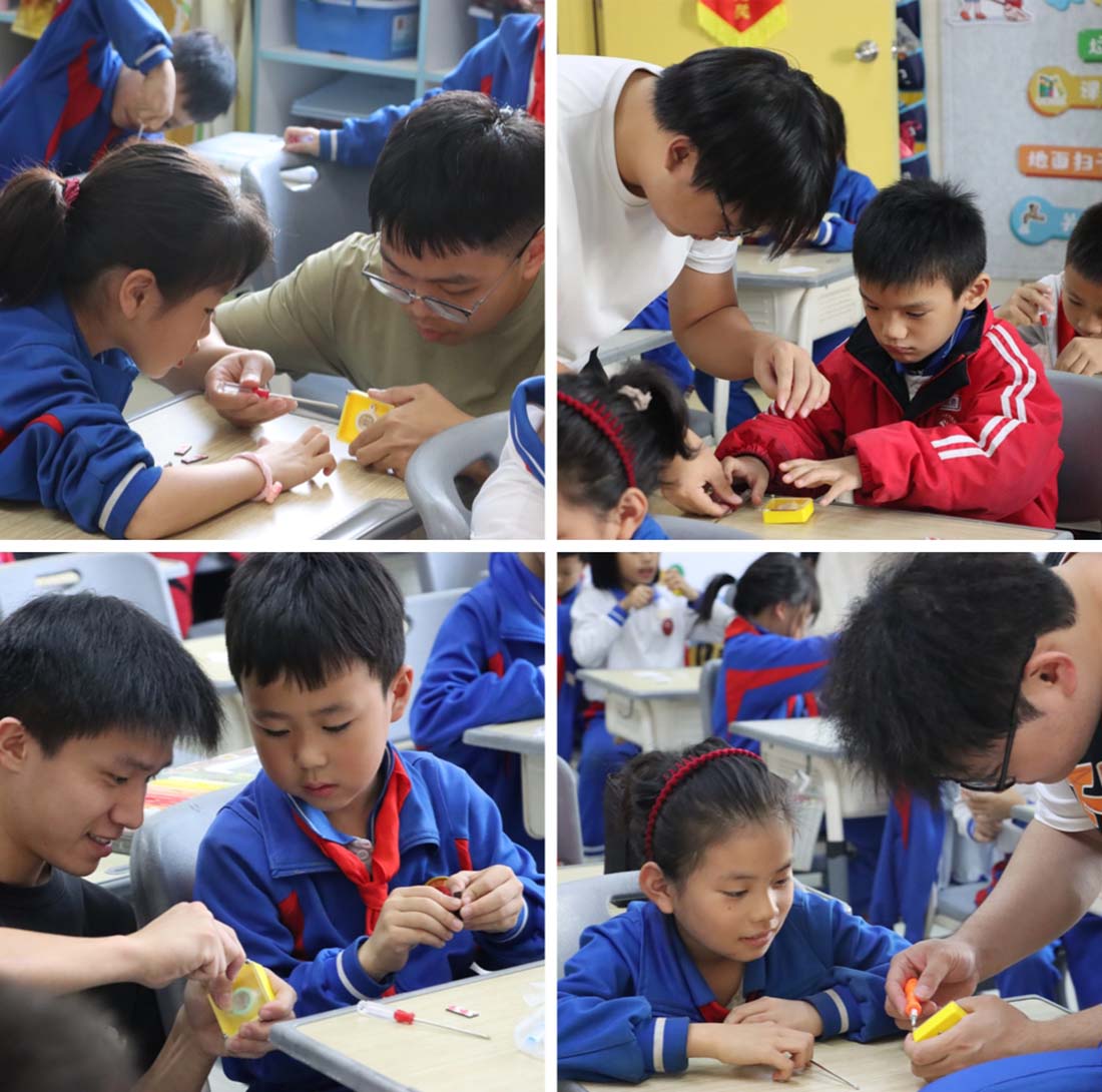 技术支持教师(容家铭等)则全程协助,“你试试这样子会不会更好一点?”“没关系,我再给你找一个,好吗?”因为他们的器材保障、细节指导,孩子们也对实践操作充满了信心。