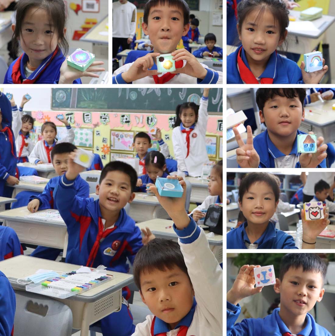 “哇,冰箱贴在你的手上闪闪发亮,就跟你一样……”班主任们全程在场组织学生,维持秩序与安全,每一句充满欣赏的语言,都给孩子们提供了积极的情绪价值。